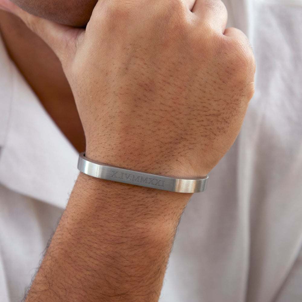 Roman Numeral Men's Brushed Stainless Steel Rectangle Cuff Bracelet