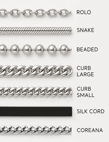 Also known as a ball chain, it’s made of connected metal spheres. A bold yet minimalist option, often seen in dog tag and modern pendant styles.