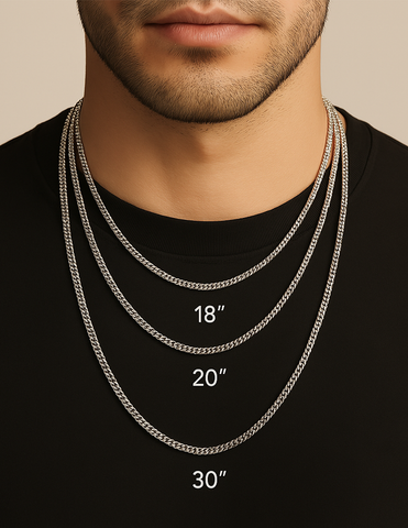 The most common chain length for men, falling right at the collarbone. Works well on its own or with a pendant.